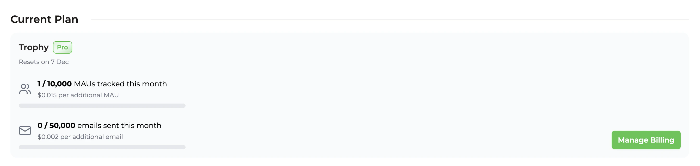 The free tier allows teams to test and evaluate Trophy up to 100 MAUs without accruing usage charges.Paid Plans