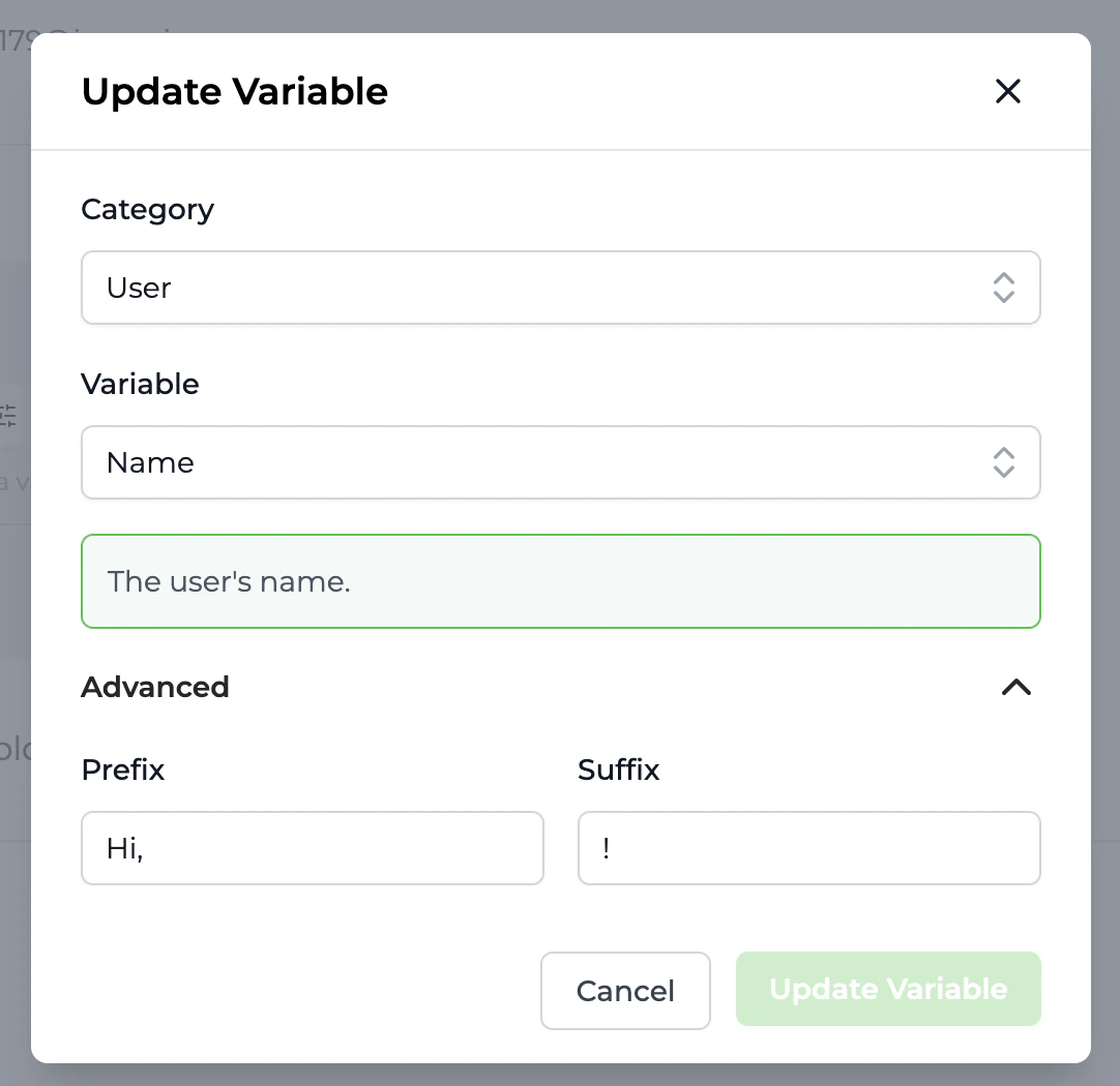 There are a couple of additional options to consider when using emails variables. Prefix & Suffix You can provide a prefix and suffix for text variables like the recipients name, or the name of a particular metric.