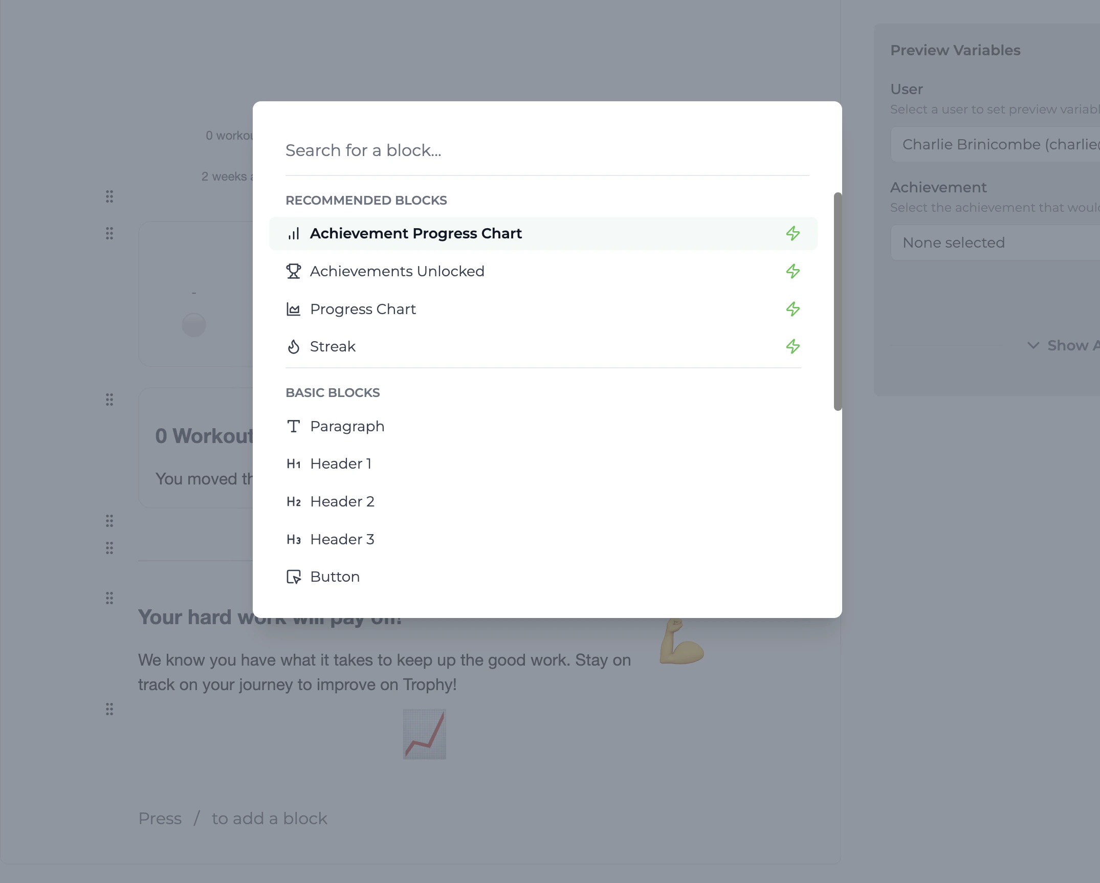 Smart blocks are powerful components designed to support common gamification use cases and integrate with all of Trophy’s features including metrics, achievements and streaks. You can find all smart blocks in the Recommended Blocks section, and they are always recognizable by the icon. Watch Charlie walk through smart blocks and how they work:Achievement Progress Chart