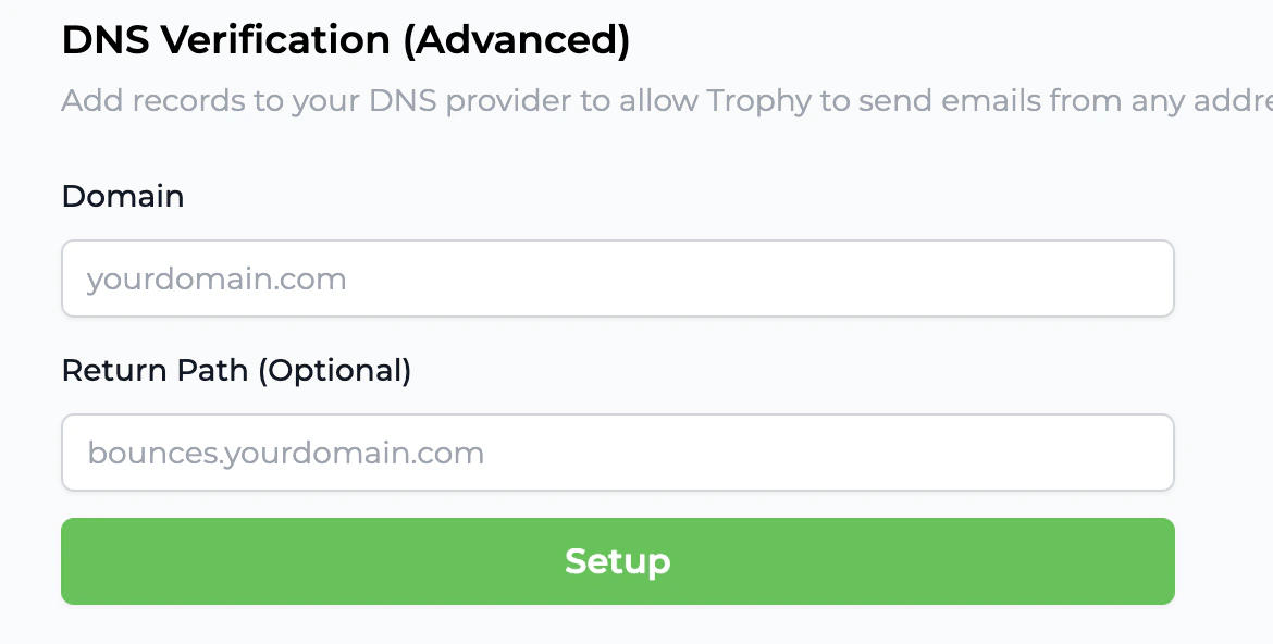 Head down to the DNS Verification section and enter the domain you want to set up with Trophy.You can also also configure a custom Return Path. This is where Trophy will forward notifications of bounced emails to help you investigate deliverability issues:
