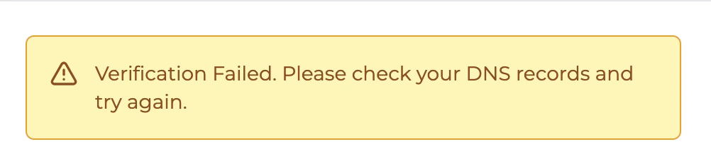 Once you’ve added the two records into your DNS settings, hit the refresh icon and Trophy will attempt to verify the records for you.Usually Trophy can verify records within a few minutes but bear in mind that DNS changes can take up to a few hours to fully propogate.If you see the following alert, the records may not have propogated yet, or there may be an issue with your setup.
