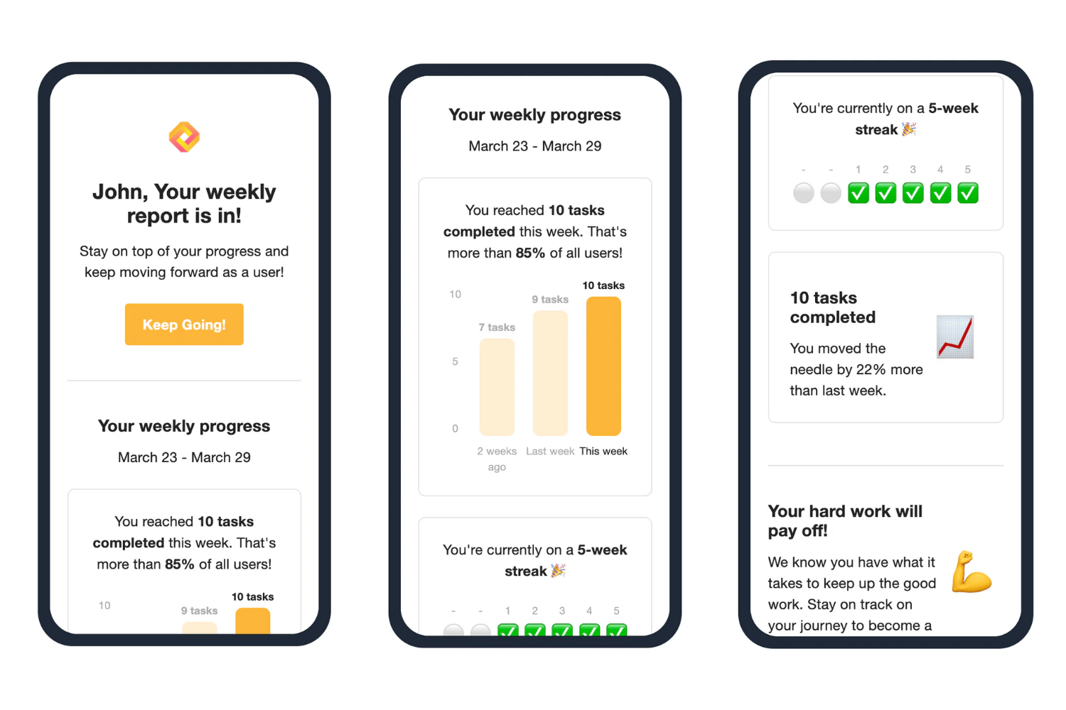 - Recap emails are sent to users on a pre-defined frequency to summarize progress. Recap Emails can be configured to be sent daily, weekly, monthly or yearly depending on your use case.