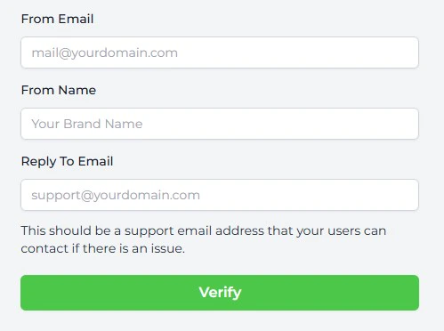 During onboarding you’ll be prompted to set up Sender Verification. This is a super simple way to quickly verify a single email address that you want to use with Trophy without needing to change any code or DNS settings. You’ll be prompted to enter the email address, from name and reply-to email that you’d like Trophy to use when sending emails: