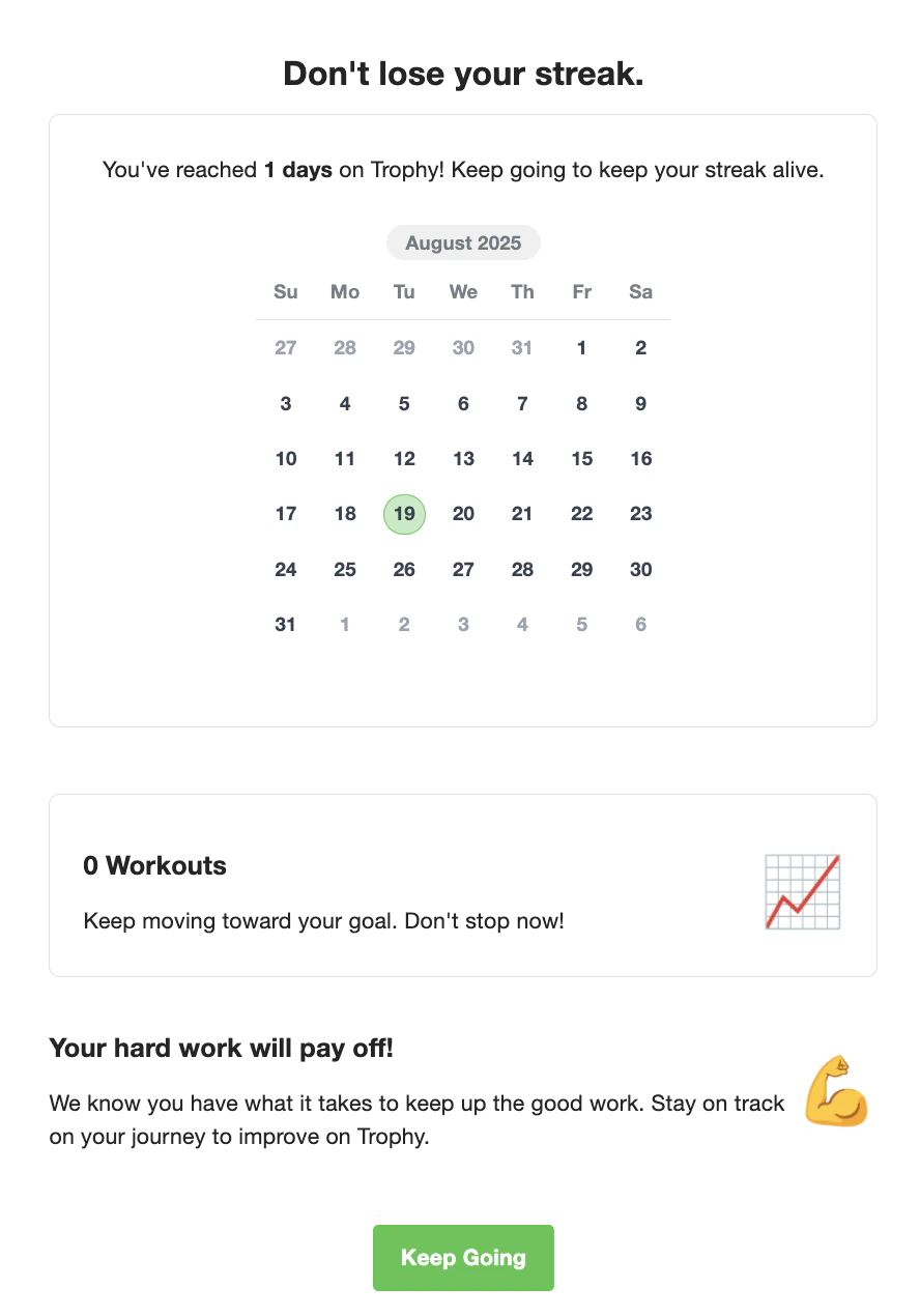 - Streak emails are automatically sent to users reminding them to extend their Streak.