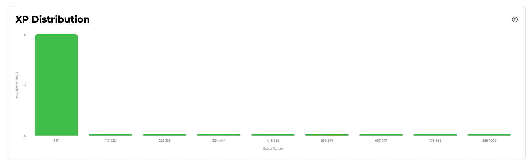 This chart is a histogram of users’ scores in a particular leaderboard. This is useful to get a sense of how bunched up or spread out users are, and what sections of the rankings are the most competitive.