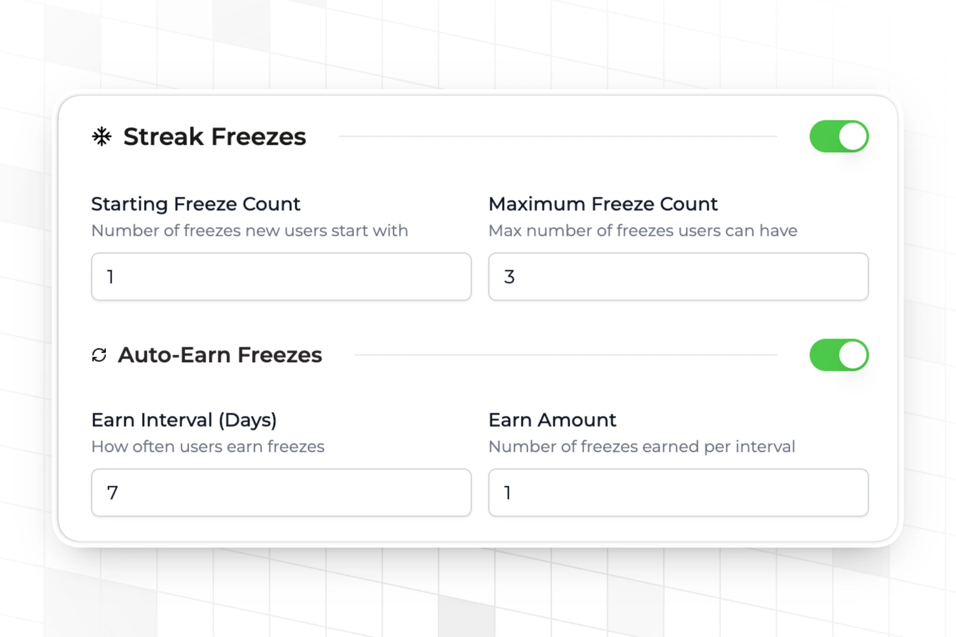 As users use up streak freezes, they’ll need a continuous supply of new ones to keep them going. To facilitate this, Trophy can automatically grant streak freezes to users over time. You can choose an arbitrary number of days over which to grant an arbitrary number of freezes to each user. If you’ve configured time zones for your users, Trophy will automatically consume freezes at midnight in the user’s time zone when necessary to extend their streak, and if any new freezes are due to be granted to a user, they will be granted up to ten minutes later.Maximum Freeze Count