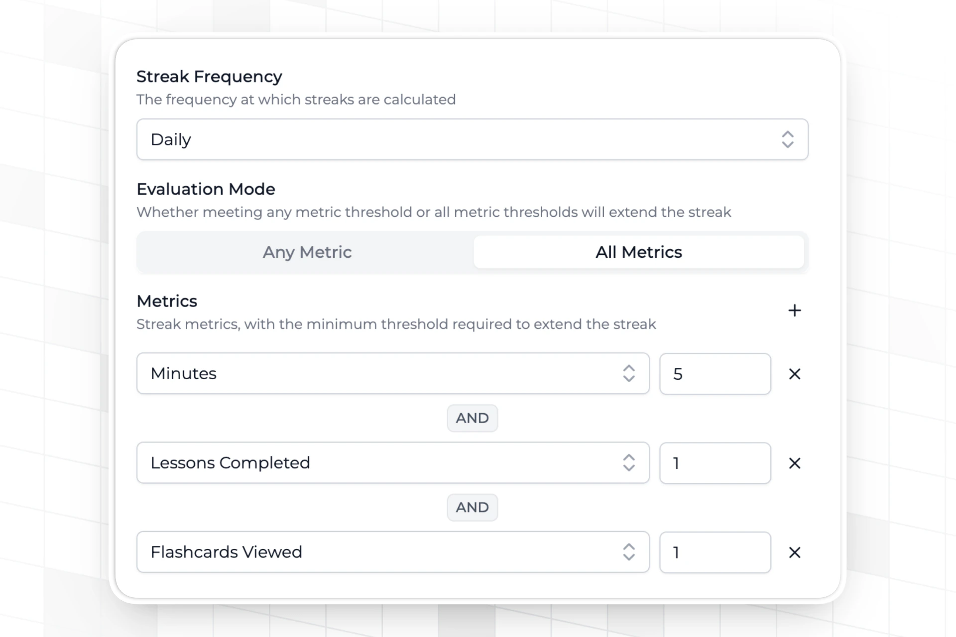 ALLmeans a user must meet every metric threshold to extend their streakORmeans a user only has to meet one of your metric thresholds to extend their streak